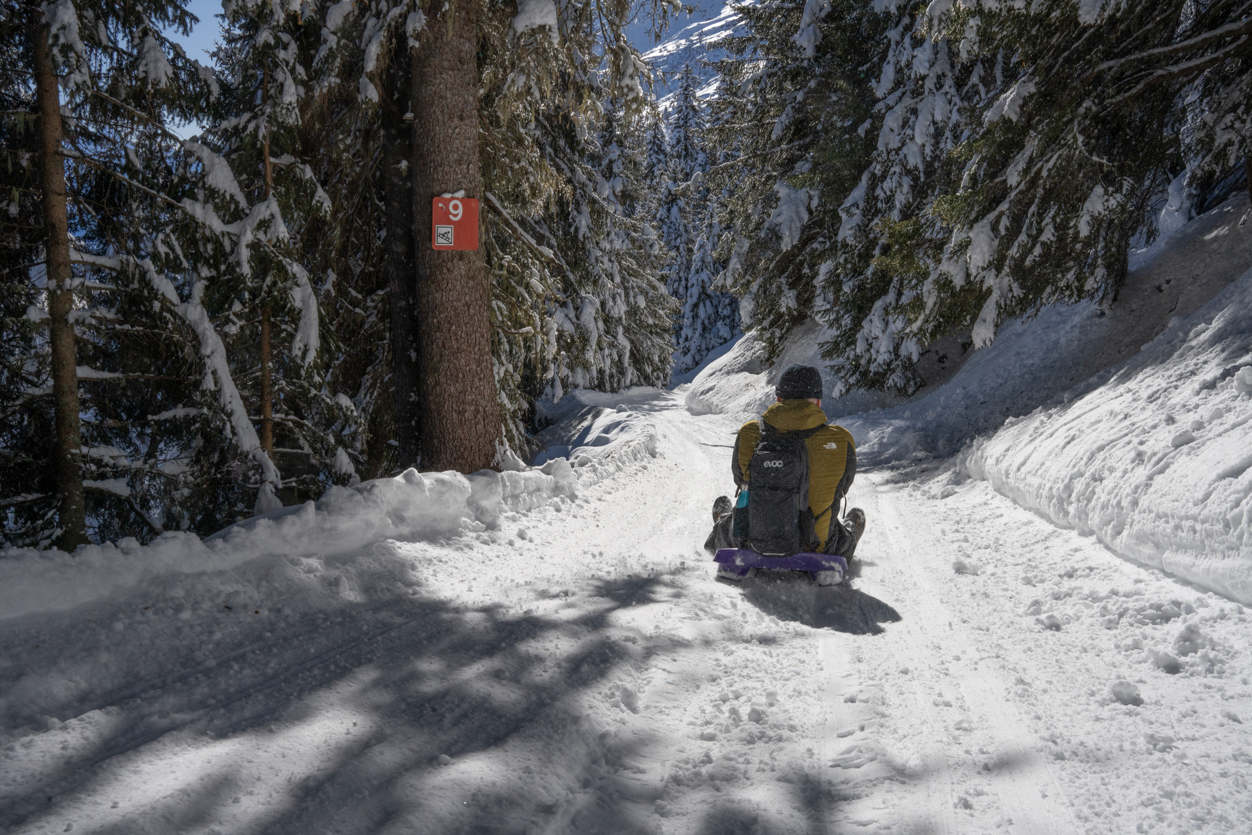 La pista da slitte si snoda lungo 5 km e 480 m di dislivello – da Pian Nara a Cancorì – tra pendii innevati e splendidi boschi di conifere.