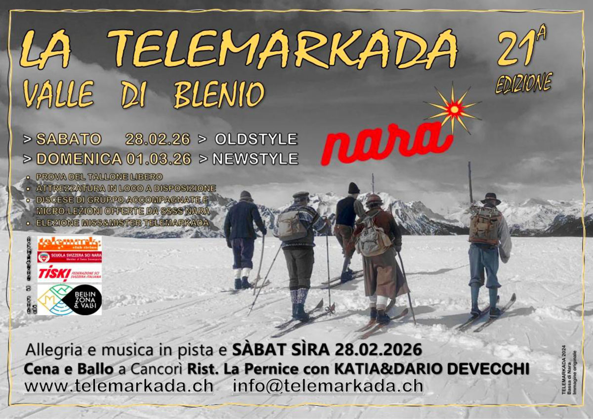 La Telemarkada è l’evento simbolo per gli amanti dello sci “a tallone libero” che si tiene regolarmente nella splendida cornice del Nara, in Valle di Blenio.